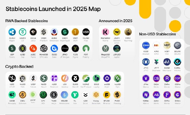 Наибольшей группой стали криптообеспеченные стейблкоины, которых в 2025 году было запущено 22. В качестве примеров упоминаются USDf и DUSD. Эти активы, как правило, используют избыточное обеспечение в криптовалютах и ориентированы на DeFi-сегмент, где важна программируемость и интеграция с ончейн-протоколами.
