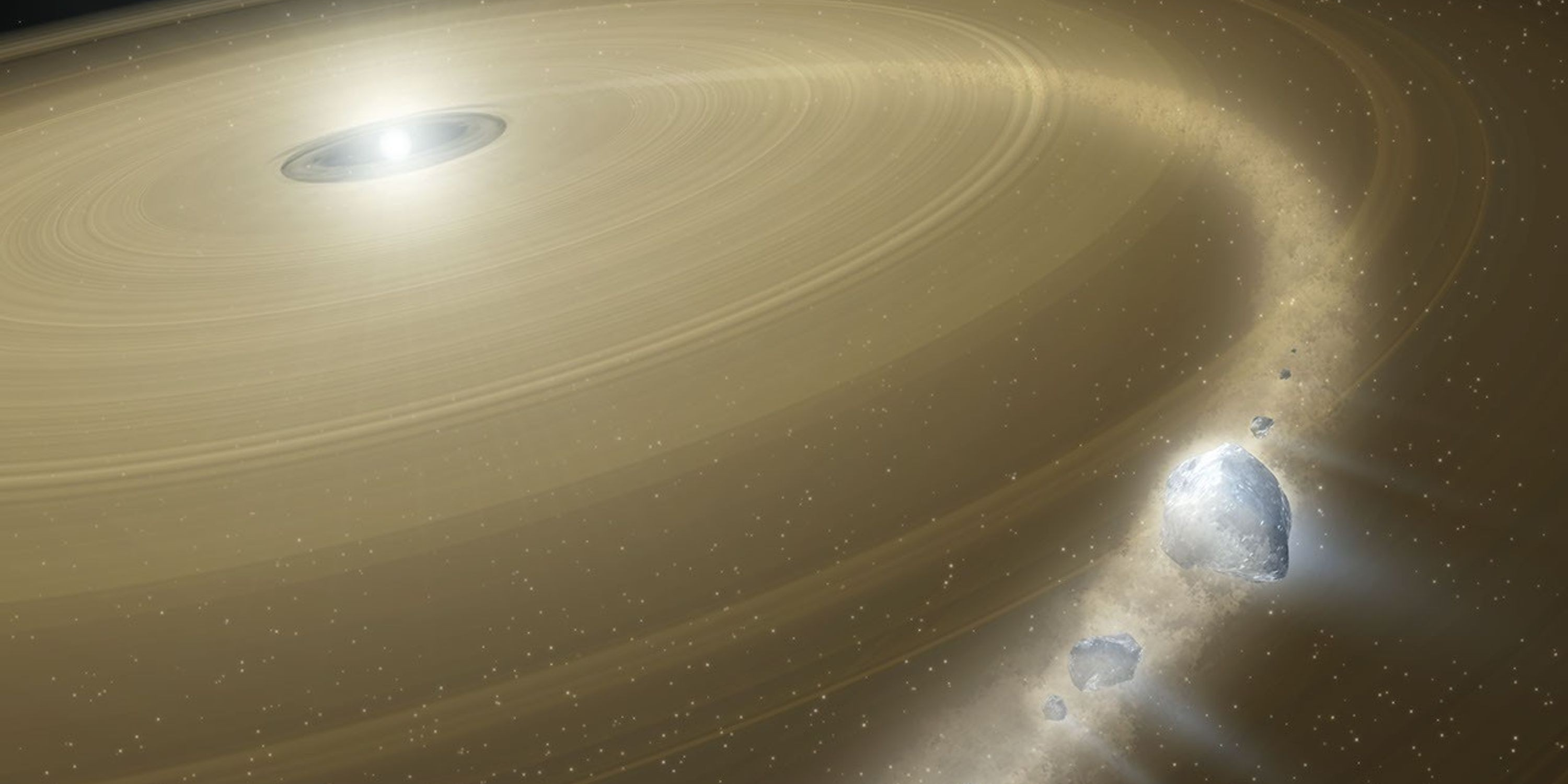 Художник NASA создал концепт этого явления: умирающая звезда окружена массивным диском из космического мусора, и на неё падают крупные обломки захваченного объекта, похожего на Плутон.